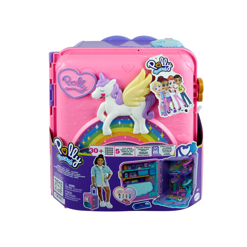 Polly Pocket Mobilny Kurort na kółkach to przenośna walizka z rączką dla łatwiejszego przemieszczania, która ma w sobie mebelki, figurki oraz akcesoria dotyczące kurortu wakacyjnego. Zabawka umożliwia wykonywanie różnych aktywności lalkami, jak zabawę na zjeżdżalni, na basenie bądź w hotelu. Niektóre elementy posiadają opcję Pop & Swap, dzięki czemu można je przymocować do wybranych miejsc. Ten poręczny zestaw pobudza wyobraźnię i zapewni wiele godzin kreatywnej zabawy. Walizka po otwarciu zatrzasków, zamienia się w mini kurort dla figurek Polly Pocket.