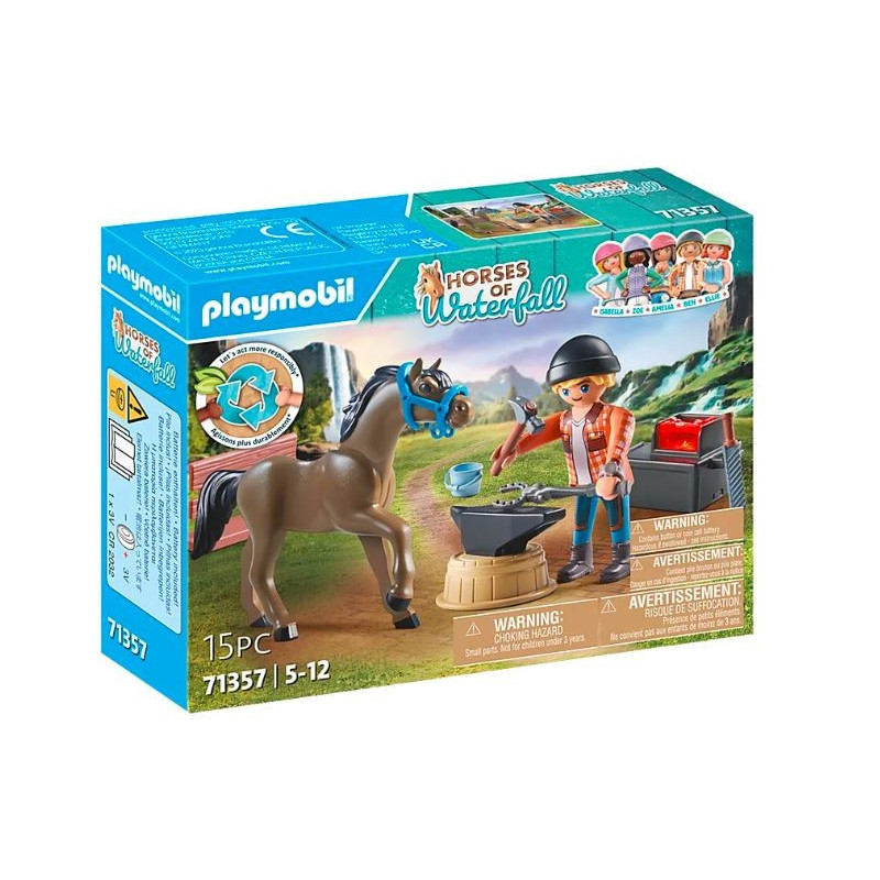 Ben jest początkującym kowalem na ranczu Waterfall. Pod ręką zawsze ma kowadło, szczypce i młotek. Jeszcze przed rozpaleniem żaru w kuźni, sprawdza i czyści kopyta koni. Odpowiednie podkowy i gwoździe są wykonywane indywidualnie dla każdego zwierzęcia. Jego praca nie zawsze należy do najłatwiejszych, jednak stara się, aby wszystkie konie w Waterfall otrzymały nowe podkowy. Jego mustang Achilles, którego Ben przywiązał do padoku na czas podkuwania, ślepo mu ufa. Ciekawostka: poprzedni kowal pracujący w Waterfall, który z racji wieku rzadko zatrzymywał się na ranczu, oddał Achillesa pod opiekę Bena. Centralnym miejscem nowego świata tematycznego PLAYMOBIL jest malownicze ranczo Waterfall, wraz z pięknie urządzonym domem z przylegającą stajnią i padokiem. To tutaj piątka najlepszych przyjaciół: Amelia, Isabella, Zoe, Ellie i Ben spędzają każdą wolną chwilę razem ze swoimi końmi. Paczka przyjaciół opiekuje się swoimi czworonożnymi ulubieńcami i przeżywa ciekawe przygody podczas treningów jeździeckich i opieki nad zwierzętami. Idealny prezent na każdą okazję dla fanów koni w wieku od 4 lat.