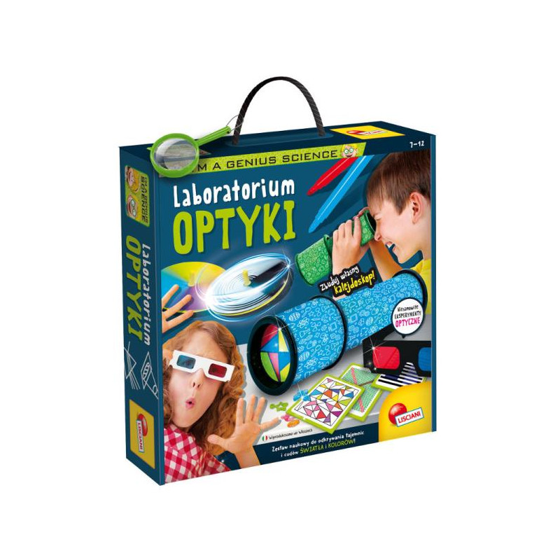 Młodzi naukowcy mogą wykonać eksperymentów i odkryć, jak działa optyka! Wewnątrz pudełka znajduje się wszystko, co niezbędne, aby eksperymentować ze światłem i kolorami oraz poznać wiele niesamowitych efektów i złudzeń optycznych. Podczas doświadczeń dzieci wykorzystają dołączone do zestawu okulary 3D oraz zbudują własny kalejdoskop. Świetna zabawa gwarantowana! I'm a genius to seria, którą można nazwać królem w kategorii eksperymentów i gier naukowych. Przeznaczona jest dla dzieci w wieku szkolnym i wzbogaca ogromny zbiór tradycyjnych gier naukowych o produkty edukacyjne, bezpośrednio związane ze światem i programem szkoły podstawowej.