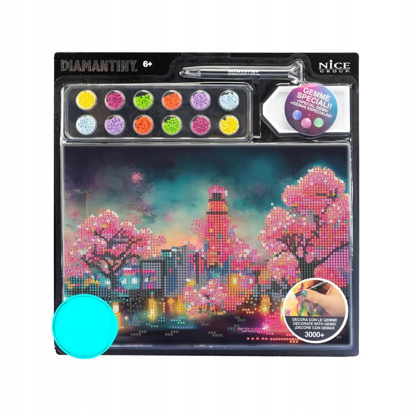 Zestaw kreatywny z kryształkami do tworzenia mozaik z kolorowymi kamieniami. Zabawa z mozaiką diamentową polega na układaniu obrazka z tysięcy malutkich, kolorowych diamencików według naniesionego na kartonie nadruku. Obrazek pokryty jest warstwą klejącą, która utrzymuje kryształki na odpowiednich miejscach. Kompletny zestaw zawiera: obrazek na grubej tekturze, na który naniesione są literki i cyfry wskazujące miejsca, gdzie należy ułożyć poszczególne kolory, diamenciki w różnych kolorach, aplikator z woskiem pojemnik na diamenciki oraz przewodnik po kolorach.