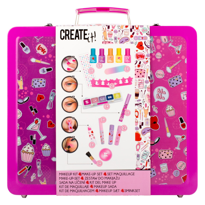 Kreatywna przygoda z zestawem do makijażu CREATE IT! Zestaw jest zapakowany w stylową, metalową walizkę. Idealny produkt na urodzinowe party lub po prostu na codzienną zabawę, ten zestaw zachęca do eksperymentowania z kolorem i stylem w bezpieczny sposób. Metalowa walizka z łatwością pomieści wszystkie elementy zestawu, ułatwiając przechowywanie i transport, dzięki czemu możesz zabrać gdzie chcesz.