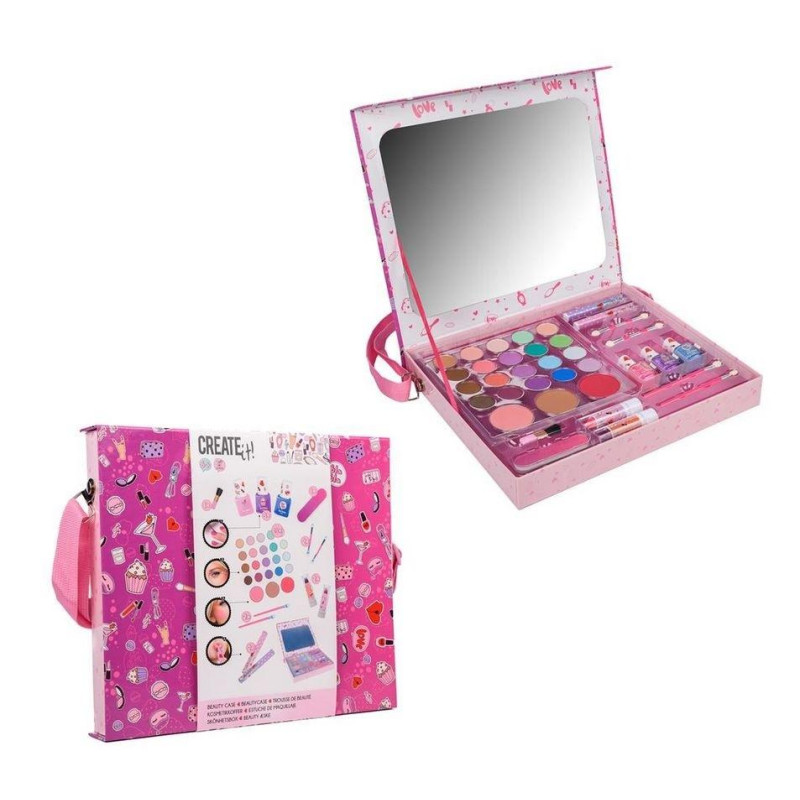 Kreatywna przygoda z zestawem do makijażu CREATE IT! Posiada szeroką gamę kosmetyków, w tym cienie do powiek, błyszczyki, róże i pędzelki, a wszystko to zapakowane w stylową, różową walizkę z lusterkiem. Idealny produkt na urodzinowe party lub po prostu na codzienną zabawę, ten zestaw zachęca do eksperymentowania z kolorem i stylem w bezpieczny sposób. Metalowa walizka z łatwością pomieści wszystkie elementy zestawu, ułatwiając przechowywanie i transport, dzięki czemu możesz zabrać gdzie chcesz.