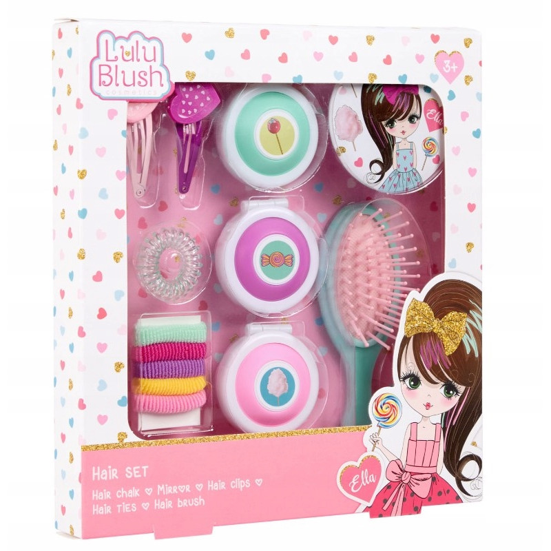 W zestawie znajdziesz kredę do włosów, która pozwoli na dodanie koloru, kolorowe gumki i spinki, które ułatwią układanie fryzur, oraz szczotkę do rozczesywania włosów.