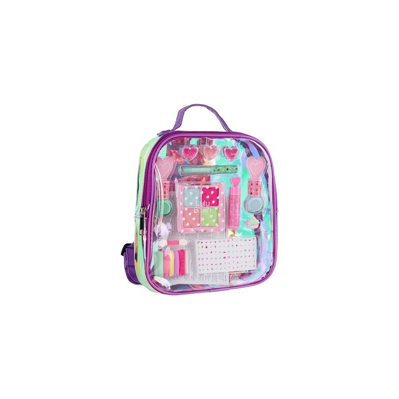 Transparentny plecak z fioletowymi wykończeniem, zawiera bogaty zestaw kosmetyków do makijażu, który pozwoli dziewczynkom na kreatywną zabawę i tworzenie własnych stylizacji. W zestawie znajdują się błyszczyki, lakiery do paznokci, cienie do powiek oraz akcesoria, które dodadzą blasku każdej małej stylizacji.