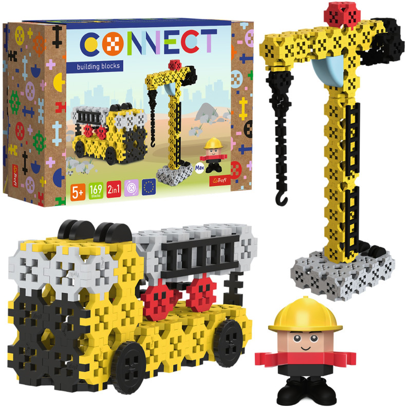 Zestaw konstrukcyjny 2w1: Construction Crane / Hydraulic Truck Crane pozwala zbudować dwie różne konstrukcje: żurawia lub dźwig HDS. W zestawie znajdziesz 169 klocków, w tym dedykowaną figurkę o imieniu Max, ruchome części i ozdoby - zbuduj z nich mobilne konstrukcje zgodnie z dołączoną instrukcją lub puść wodzę fantazji i daj upust kreatywności, realizując swoje pomysły. Poznaj serię Connect i zbuduj swój własny świat z klocków! Kolekcjonuj figurki i zamieniaj ich elementy, aby tworzyć jeszcze ciekawsze historie. Klocki Connect to wspaniała zabawa dla małych i dużych! Rozwijają kreatywność, uczą logicznego myślenia i rozwiązywania problemów. Pomagają zrozumieć zasady równowagi oraz symetrii, ćwiczą precyzję i umiejętności manualne. Klocki zawierają domieszkę celulozy, która pozwala zredukować zużycie plastiku, opakowania posiadają certyfikat FSC, a lokalna produkcja zmniejsza ślad węglowy.