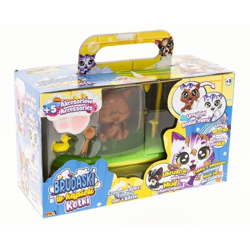 Kolekcja przesłodkich kotków, które można brudzić błotkiem, myć i zaczynać całą zabawę od nowa! Brudaski w kąpieli kotki to urocze figurki, które zostały stworzone po to, by zapewnić dzieciom mnóstwo radości i niezliczone możliwości kreatywnej zabawy. Dzięki specjalnej powłoce łatwo je wyczyścić, a zabawę ulepszą dołączone do kotków akcesoria. Brudaski w kąpieli kotki w saszetce to dodatkowa niespodziana! Można trafić na kotka świecącego w ciemności! Każdy zestaw Brudaski w kąpieli pozwala dzieciom na wielogodzinną zabawę, która rozwija wyobraźnię i umiejętności manualne. Te wspaniałe kotki będą świetnym towarzyszem podczas kąpieli, ucząc jednocześnie dbania o czystość i higienę w sposób zabawny i angażujący.