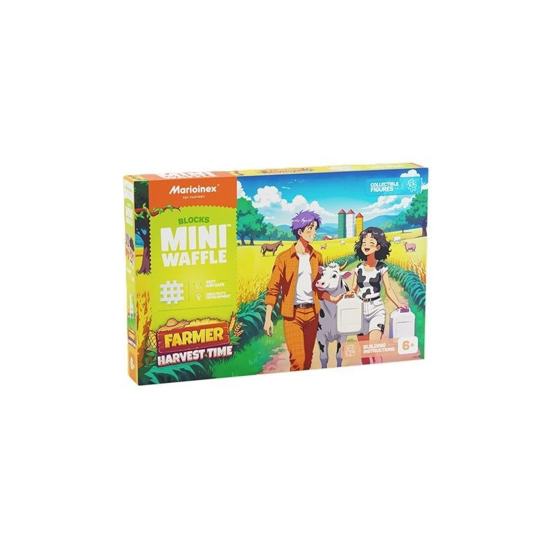 Mini Waffle Farmer Czas zbiorów Pełne magazyny i mnóstwo pracy! W Mini Waffle Farm nadszedł najważniejszy moment w roku czas zbiorów! Rolnicy Tommy i Zoe mają pełne ręce roboty: zboże, kukurydza i mleko trafiają do ogromnych silosów, a zwierzęta z zainteresowaniem obserwują całe zamieszanie. Wokół biegają owce, krowy i konie, a gospodarze dbają, by wszystko było zorganizowane jak należy. Gdy farma pracuje pełną parą, każdy dzień to nowa przygoda! Gotowi na sezon pełen plonów? Zestaw Mini Waffle Farmer Czas zbiorów zaprasza dzieci do świata wielkich żniw i wiejskich obowiązków. Zbuduj trzy kolorowe silosy na mleko, kukurydzę i zboże oraz odtwórz farmę z jej naturalnym rytmem. Kto dziś przewozi zbiory, a kto karmi zwierzęta? Wszystko zależy od Ciebie! Zbuduj własne gospodarstwo w szczycie sezonu!