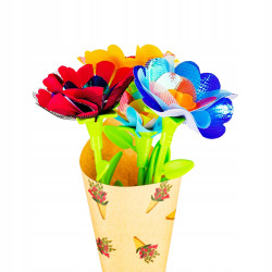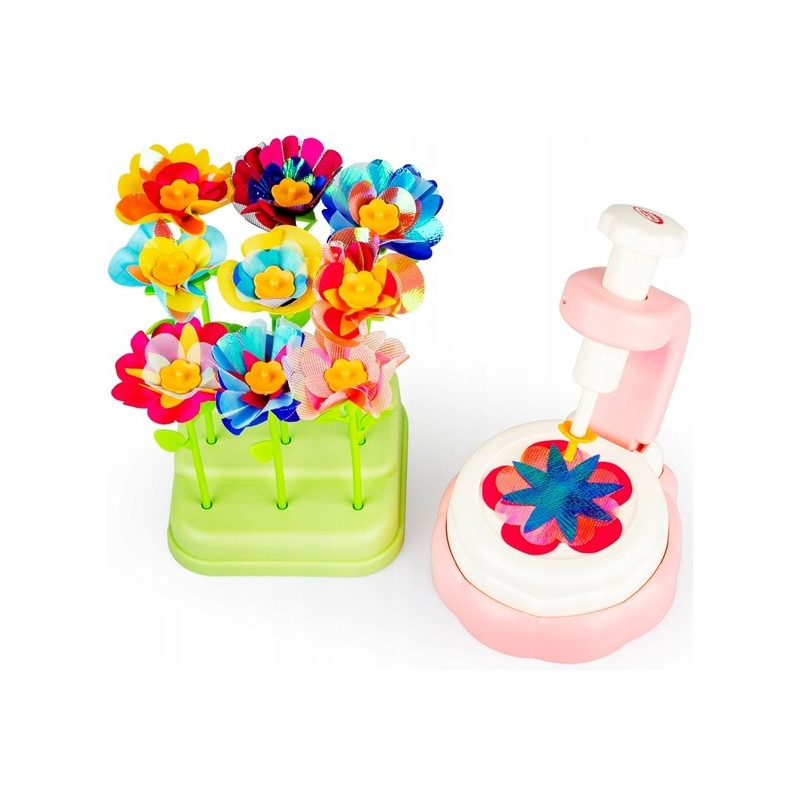Stwórz kwiatki i komponuj z nich barwne bukiety, tworząc małe dzieła sztuki. Wybierz płatki, umieść je w maszynce, a następnie połącz płatki ze środkiem oraz szypułką. Zabawkowe roślinki możesz wyeksponować w dołączonym do zestawu wazoniku, stojaku lub, umieszczając je w papierowym rożku, stworzyć z nich bukiet. Te piękne ozdoby sprawdzą się też wspaniale w charakterze prezentu dla bliskiej osoby.