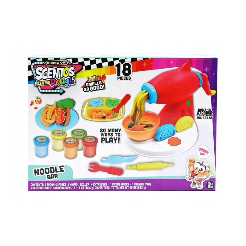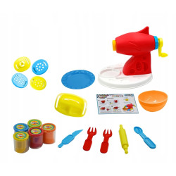 W zestawie 18 elementów: 1 zabawkowa łyżka, 2 zabawkowe widelce, 1 zabawkowy nóż, 1 zabawkowy wałek, 4 końcówki do wyciskania, zabawkowa maszynka do tworzenia ciastolinowego makaronu, 1 zabawkowa tacka do serwowania, 1 zabawkowy talerzyk, 1 zabawkowa miska, 5 kubeczków z zapachową ciastoliną (w różnych kolorach).