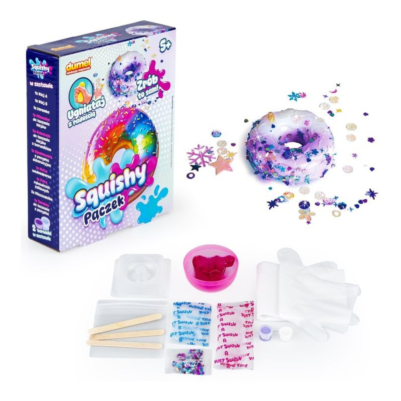 Kreatywny zestaw SQUISHY zawiera wszystko czego potrzeba, do wykonania własnego, kolorowego pączka, którego można zgniatać do woli. W tym celu należy połączyć ze sobą klejące masy, rozlać je do kubeczków i do każdego z nich dodać barwnik w innym kolorze, a następnie wlać tak przygotowane mikstury do pączkowej formy. Po całkowitym wyschnięciu, gotowego pączka można wyjąć z foremki, aby cieszyć się samodzielnie stworzonym squishy.
