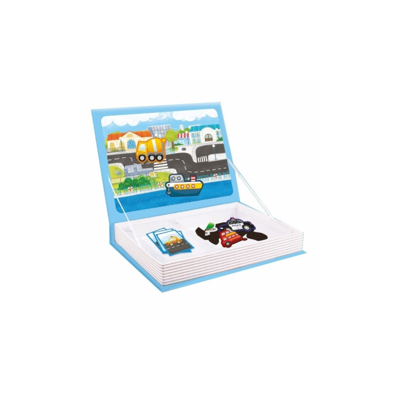 Puzzle pojazdy to kreatywny zestaw, który ma formę praktycznej książeczki z magnetyczną planszą oraz kolorowymi elementami przedstawiającymi różne pojazdy. Dziecko może swobodnie przyczepiać magnesy i tworzyć własne scenki w miejskiej scenerii z ulicami, budynkami i portem. W komplecie znajdują się liczne magnetyczne elementy z pojazdami, takimi jak m.in. wóz strażacki, radiowóz, betoniarka, helikopter czy statek, a także karty z zadaniami do odwzorowywania układów na planszy. Zabawa rozwija kreatywność, zdolności manualne, koordynację wzrokowo-ruchową oraz pomaga poznawać różne pojazdy i ich funkcje. Poręczna forma książki sprawia, że zestaw świetnie sprawdzi się zarówno w domu, jak i w podróży.