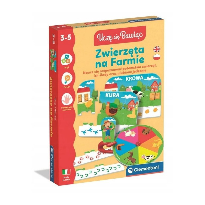 Edukacyjna układanka - puzzle przeznaczona dla najmłodszych dzieci, które zaczynają poznawać świat zwierząt i rozwijać podstawowe umiejętności manualne. Zestaw przedstawia kolorowe ilustracje zwierząt spotykanych na farmie, takich jak krowa, koń, kura czy świnka. Elementy są duże i wygodne do chwytania, dzięki czemu dobrze sprawdzają się u małych dzieci. Układanie wspiera rozwój koordynacji ręka–oko, koncentracji oraz zdolności rozpoznawania kształtów i dopasowywania elementów. Produkt wykonany jest z trwałych, bezpiecznych materiałów, typowych dla marki Clementoni, i zaprojektowany tak, aby łączyć zabawę z nauką poprzez rozpoznawanie zwierząt oraz pierwsze próby logicznego myślenia.