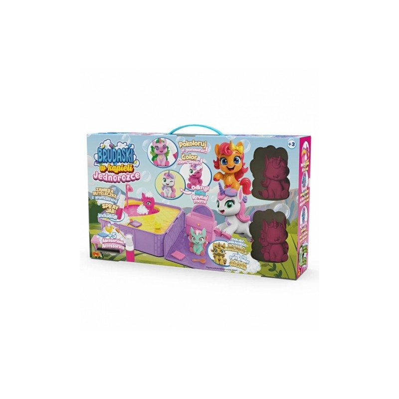 Kreatywny zestaw zabawkowy, w którym dzieci opiekują się figurkami jednorożców – brudzą je specjalnym „błotkiem”, a następnie myją w dołączonym jacuzzi. Zabawka zachęca do odgrywania scenek pielęgnacji i rozwija wyobraźnię oraz zdolności manualne.