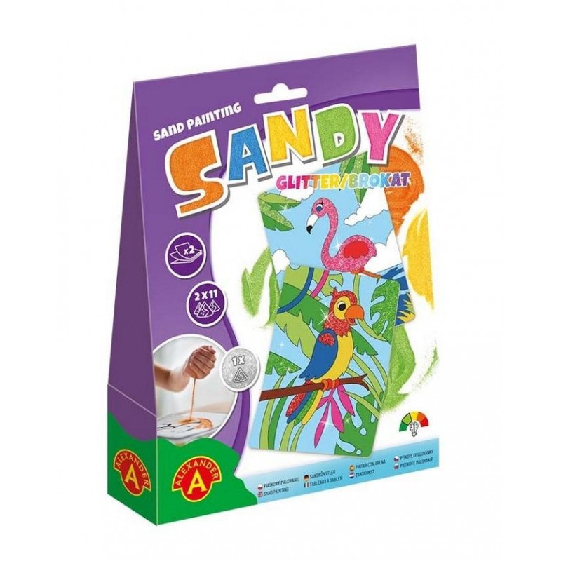 Piaskowe malowanki z brokatem, jest to zabawa która polega na odsłanianiu poszczególnych elementów obrazka, tak by odkryć powierzchnię wybranego fragmentu. Odsłonięte elementy posypuje się piaskiem w kolorze zgodnym ze wzorem, tworząc piękną ilustrację. Zabawa, dzięki której dziecko niemające artystycznych zdolności nabiera wiary w swoje możliwości.