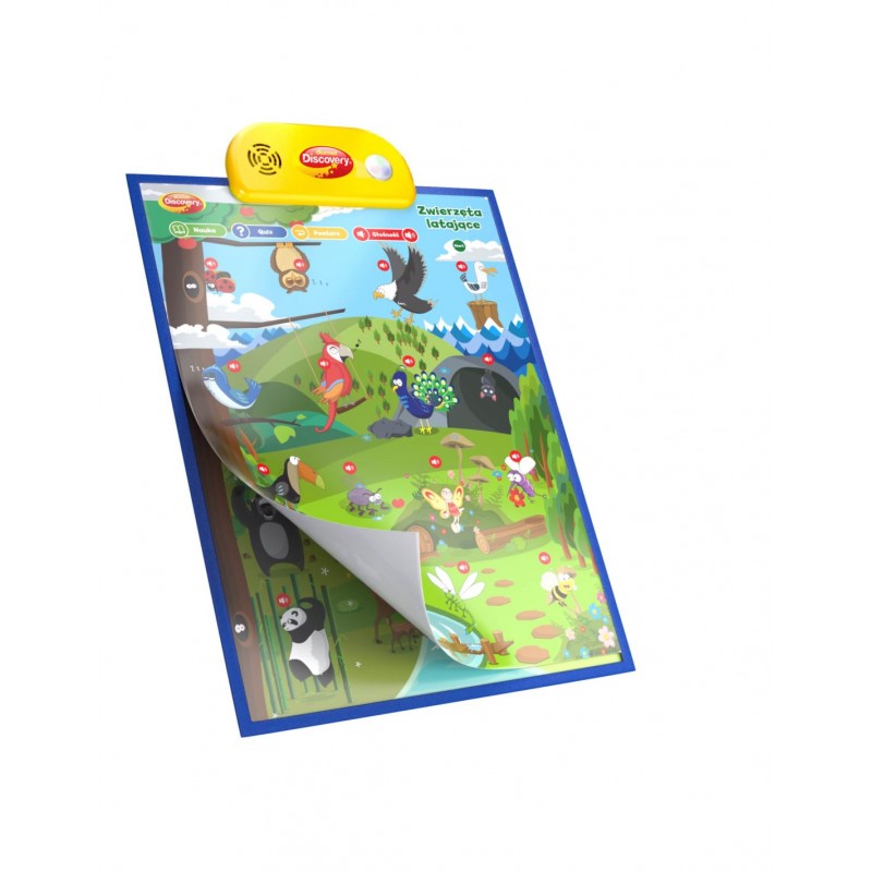 Poznawaj zawody i odkrywaj zwierzęta z zestawem edukacyjnych plakatów. W opakowaniu znajdują się 3 plakaty: zwierzęta lądowe, zwierzęta latające oraz zawody, a każdy z nich umożliwia zabawę na dwa różne sposoby. W trybie - Nauka plakat opowiada ciekawostki na temat zwierząt lub zawodów, a w trybie - Quiz, zadaje pytania, co pozwala zweryfikować przyswojone wcześniej informacje. Aby przystąpić do zabawy, należy uruchomić zabawkę, naciskając na okrągły guzik umieszczony w górnym module, wybrać interesujący nas plakat i za pomocą ukrytych magnesów przyczepić go do plakatu bazowego, a następnie nacisnąć przycisk START, widoczny na plakacie. Plakat bazowy jest także aktywny.