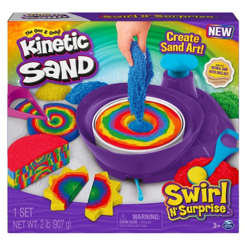 Piasek kinetyczny jest tak satysfakcjonujący, że nikt nie będzie miał ochoty go odłożyć. Wykonany z naturalnego piasku, Kinetic Sand magicznie się skleja i nigdy nie wysycha. Możesz więc tworzyć coś cały czas. Piasek kinetyczny Zakręcone Kolory pozwoli tworzyć niekończące się wirujące masy, które urzekają kolorami i barwnymi przekrojami. Zakręć swoją wyobraźnią!