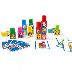 Na kolorowych klockach znajdują się wizerunki 15 członków rodziny m.in. mamy, taty, córki, syna, dziadka, babci, wujka, ale również ulubionych zwierząt domowych takich jak kot czy pies. Zadaniem uczestników gry jest ułożenie różnych sekwencji z klocków, zgodnie z dołączonymi do zestawu dwudziestoma kartami. Wszystkie sekwencje podzielone są na 5 grup tematycznych, można zatem układać je w ramach jednej grupy/tematu. Zagrajcie w grę, która rozwinie spostrzegawczość, myślenie analityczne i zmysł obserwacji, ale wpłynie również na rozwój relacji w rodzinie i da pretekst do ciekawych rozmów. Zobacz, kto kogo zabierze na barana. Dla 1-2 graczy. Zawartość opakowania: