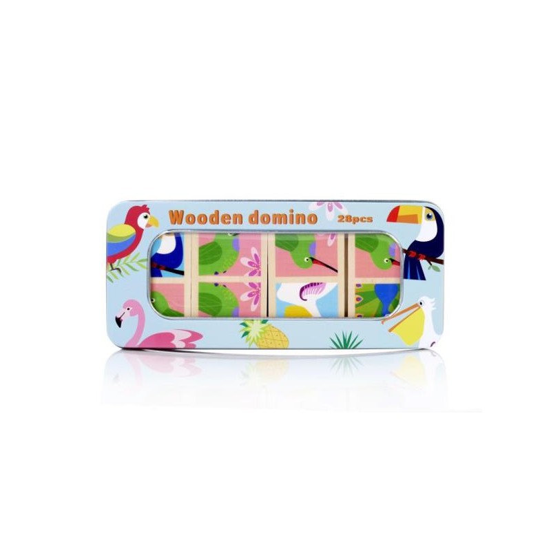 Drewniane domino składające się z 28 elementów spakowane w metalowe, prostokątne pudełko z okienkiem. Na kostkach domina widać różne ptaki. Gra polega na ułożeniu wszystkich klocków łącząc je w pary. Wygrywa ten, kto pozbędzie się domina. Idealna gra do spędzenia wspólnego czasu z dzieckiem.